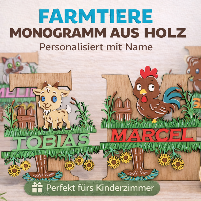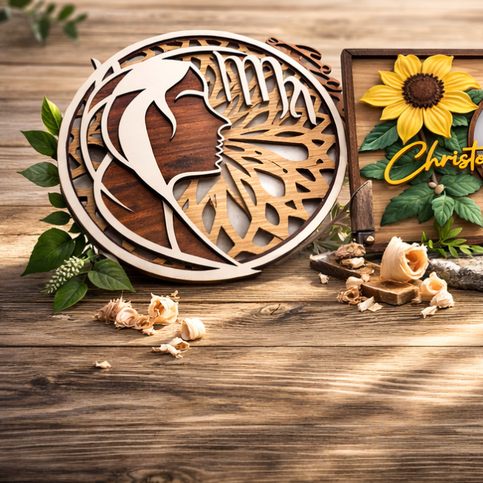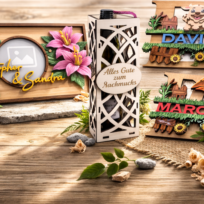 Personalisierte Holzdekorationen, Monogramme und Geschenke – präzise gefertigt und mit Liebe gestaltet.
